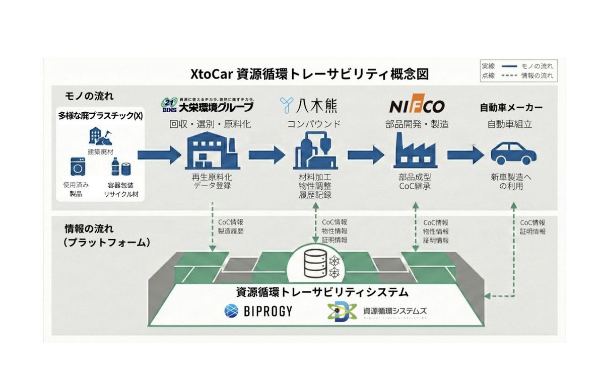 大栄環境株式会社、BIPROGY株式会社、資源循環システムズ株式会社、株式会社八木熊、株式会社ニフコの5社は2026年2月、多様な廃プラスチック(X)を自動車部品(Car)へと再資源化する「XtoCar」サプライチェーンにおいて、「資源循環トレーサビリティサービス」を活用したPoC(概念実証)を開始した。